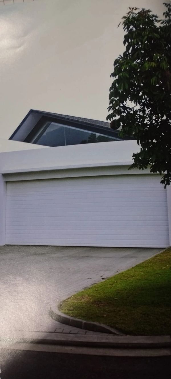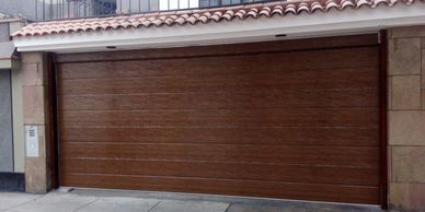 Portones de garaje de paneles ascendentes, con doble lámina y poliuretano, disponibles en diseños de cuadros, rayas y tablón. Incluyen herrajes de torsión y extensión, y apertura automática con motor eléctrico.